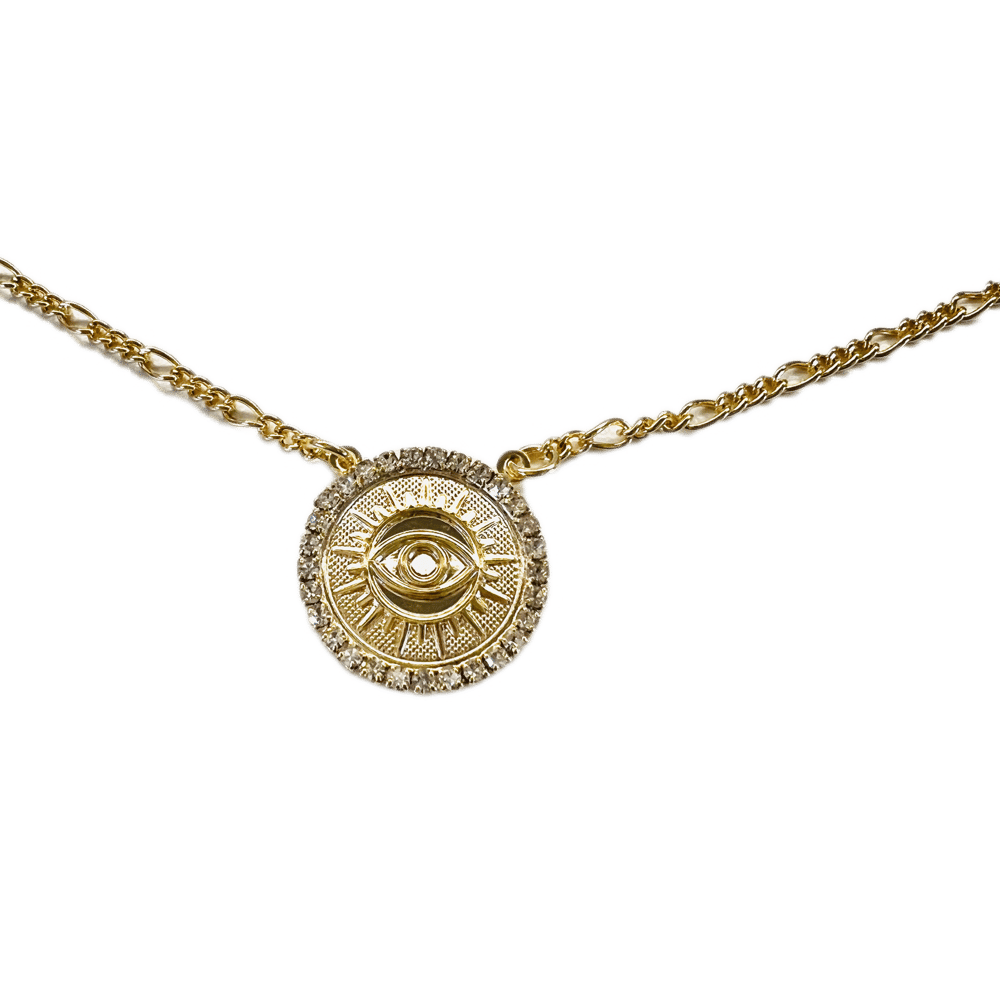 Features cubic zirconia medallion 18” chain + 2 inch extender great for layering necklace Figaro chain Water safe jewelry Comes with velvet storage pouch